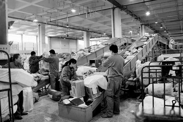 遇到“双十一”快递高峰期,工作人员加班分拣投递包裹