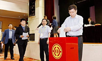 省总工会党组书记、主席白阿莹(右一)正在投票。(记者 刘强 摄)
