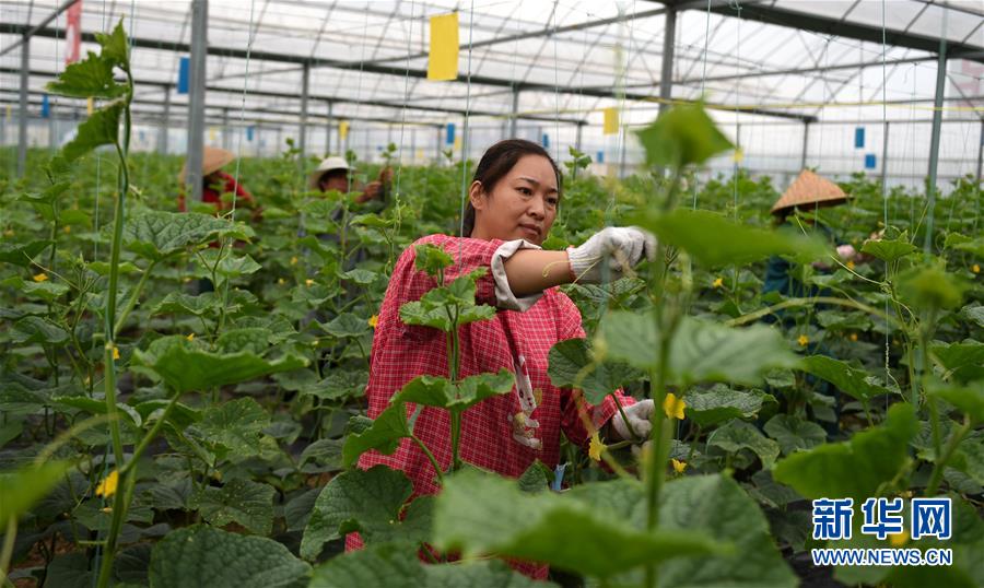 在河南新蔡县砖店镇,一位村民在产业扶贫基地黄瓜温棚里劳动(9月10日摄)。(宋超喜摄)