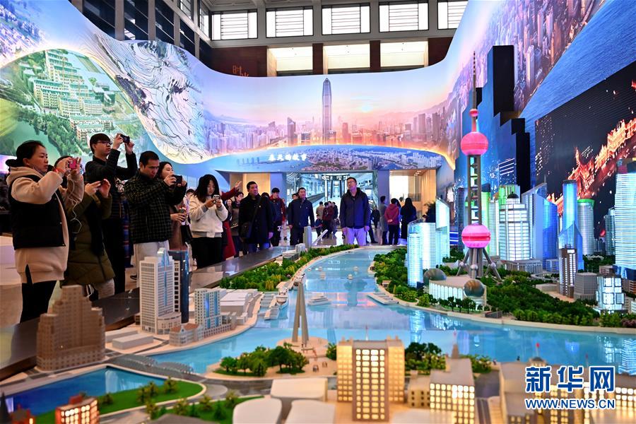 观众在“伟大的变革——庆祝改革开放40周年大型展览”上观看上海浦东陆家嘴实景沙盘(11月14日摄)。 记者 李鑫 摄