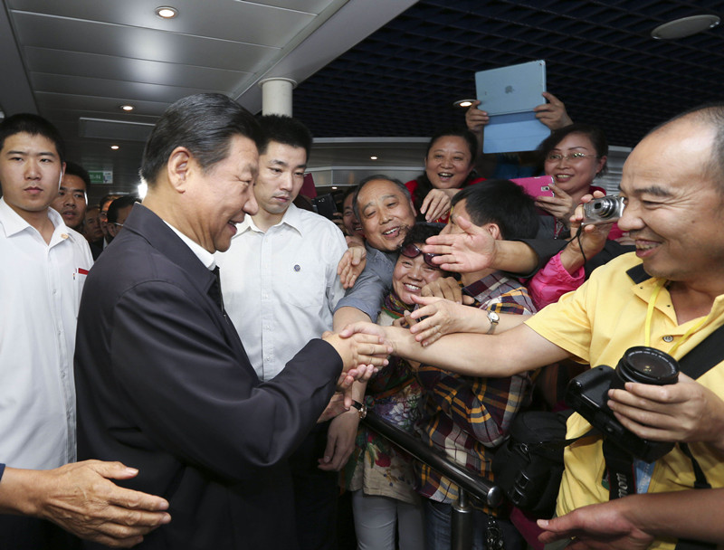 2014年11月1日上午,习近平在平潭海峡高速客运码头登上“海峡号”客轮与赴台的两岸旅客握手交流。新华社记者 兰红光 摄