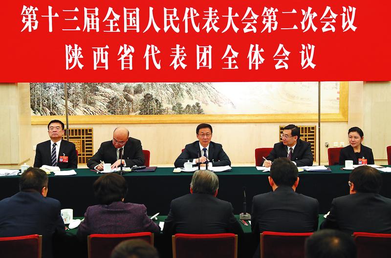 3月5日下午,中共中央政治局常委、国务院副总理韩正来到他所在的陕西代表团,同代表们一起审议政府工作报告。 记者 宋红梅摄