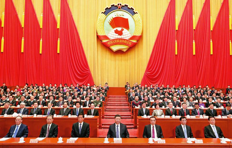 3月13日,中国人民政治协商会议第十三届全国委员会第二次会议在北京闭幕。这是习近平、李克强、栗战书、王沪宁、赵乐际、韩正、王岐山等在主席台就座。 记者 黄敬文 摄
