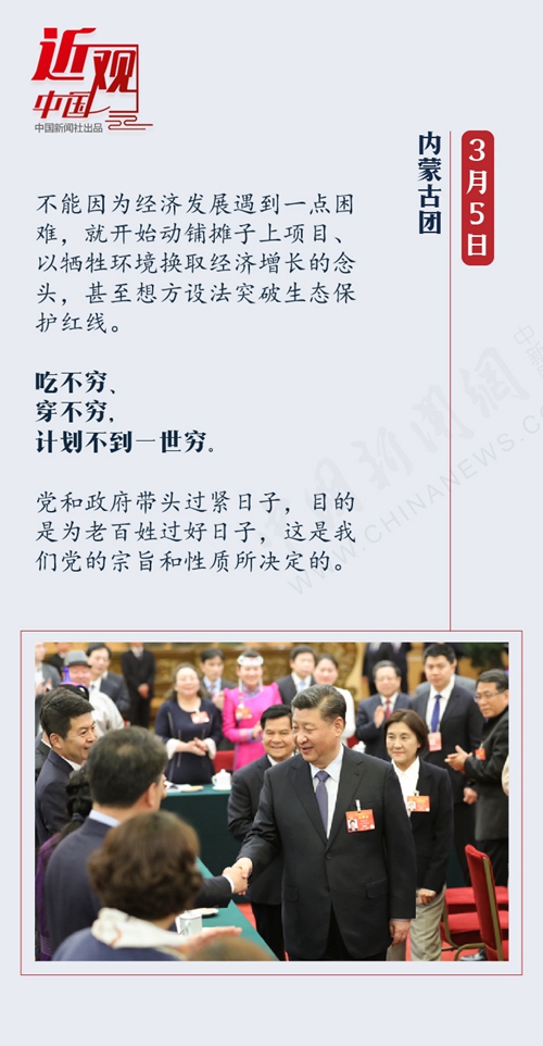 “不能因为经济发展遇到一点困难,就开始动铺摊子上项目、以牺牲环境换取经济增长的念头,甚至想方设法突破生态保护红线。”在内蒙古团,他以“不动摇、不松劲、不开口子”,强调要保持加强生态文明建设的战略定力,要探索以生态优先、绿色发展为导向的高质量发展新路子。