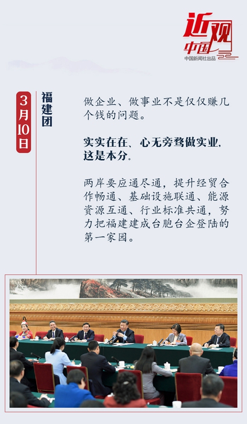 在福建团,习近平听了安踏公司董事局主席、总裁丁世忠讲述福建民营企业的发展情况后指出,做企业、做事业,不是仅仅赚几个钱的问题。做实体经济,要实实在在、心无旁骛地做一个主业,这是本分。