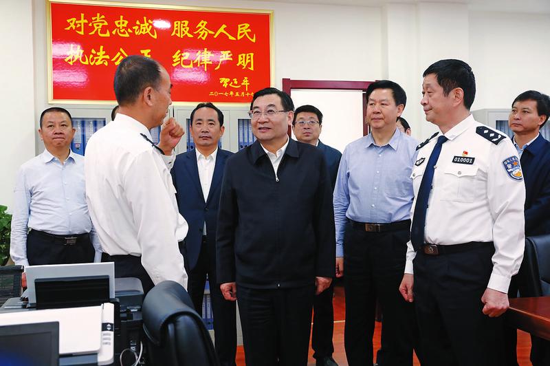 5月21日,省委书记胡和平深入西安市灞桥区、渭南市临渭区调研扫黑除恶专项斗争情况。图为他在西安市公安局灞桥分局仔细了解涉黑涉恶线索摸排、案件侦办等情况。 记者 宋红梅摄