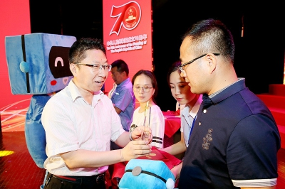 张剑(左一)为获得一等奖的合唱团颁奖