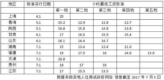 此外,安徽省于2017年2月1日开始实施新的最低工资规定,细化最低工资标准的规则,保障劳动者申诉、申请仲裁的权利。而四川省、广东省日前已明确都表示,2017年最低工资标准暂不上调,将按照以往发布的标准执行。