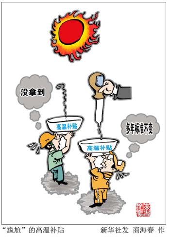 漫画:“尴尬”的高温补贴 7月12日入伏以来,全国多地陷入持续“蒸烤模式”,南北方大范围地区最高气温达35℃以上。商海春 作