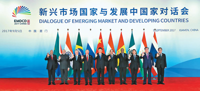 九月五日,国家主席习近平在厦门国际会议中心主持新兴市场国家与发展中国家对话会并发表重要讲话。金砖国家领导人巴西总统特梅尔、俄罗斯总统普京、印度总理莫迪、南非总统祖马和对话会受邀国领导人埃及总统塞西、几内亚总统孔戴、墨西哥总统培尼亚、塔吉克斯坦总统拉赫蒙、泰国总理巴育出席对话会。这是对话会前,习近平同出席对话会的各国领导人集体合影。