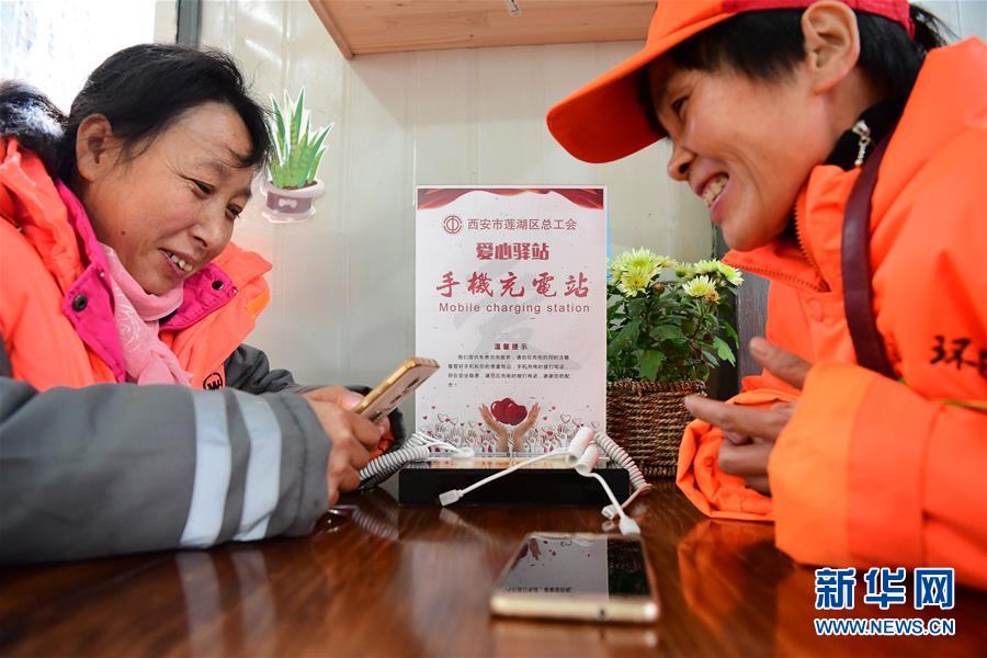 11月20日,环卫工人在西安市莲湖区大庆路一处“工会爱心驿站”内吃午饭。西安市总工会从2017年7月开始在全市建立“工会爱心驿站”,为包括环卫工人、出租车司机、交警及城管执法人员、市政园林工、快递外卖员等在内的户外工作者提供服务,解决他们“吃饭难、喝水难、休息难、如厕难”等实际问题。截至目前,西安已建成“工会爱心驿站”105个,免费服务2万人次以上。(记者 邵瑞 摄)