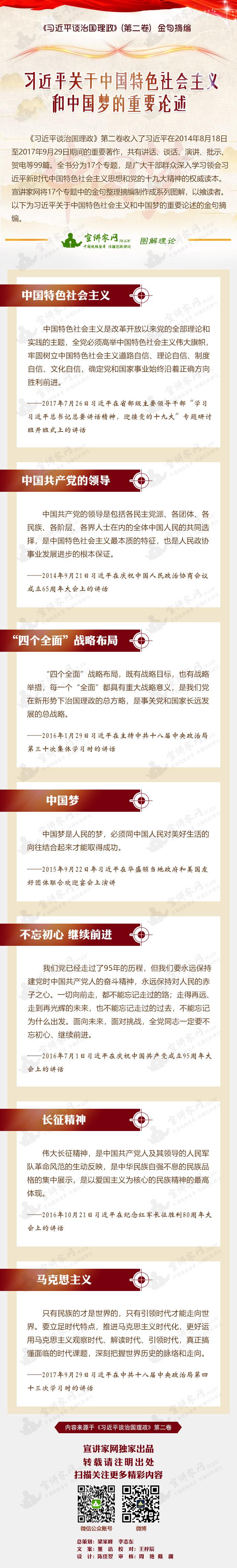 摘要:《习近平谈治国理政》第二卷收入了习近平在2014年8月18日至2017年9月29日期间的重要著作,共有讲话、谈话、演讲、批示、贺电等99篇。全书分为17个专题,是广大干部群众深入学习领会习近平新时代中国特色社会主义思想和党的十九大精神的权威读本。宣讲家网将17个专题中的金句整理摘编制作成系列图解,以飨读者,以下为习近平关于中国特色社会主义和中国梦的重要论述的金句图解。