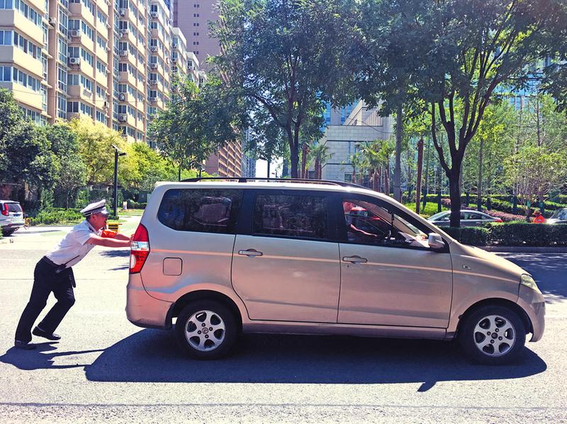 7月26日,安保人员张宏涛在烈日下帮助货车司机推车。 记者 王婕妤摄