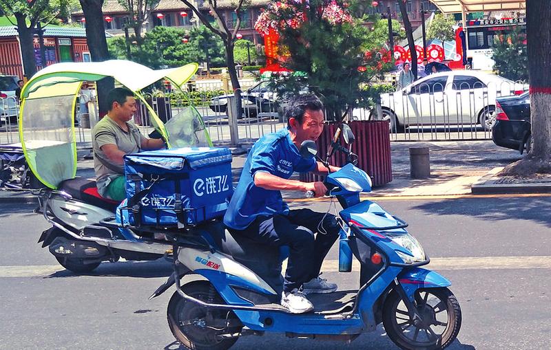 7月23日,西安市西大街上,送餐员头顶烈日前往目的地。 记者 王婕妤摄