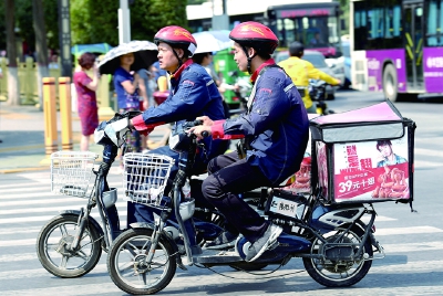 西安市莲湖路,外卖员头顶烈日,骑着电动车穿过十字路口,将餐食按时送到客户手中。