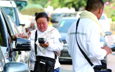 西安市北院门,停车收费员对即将驶离车位的车辆进行收费。