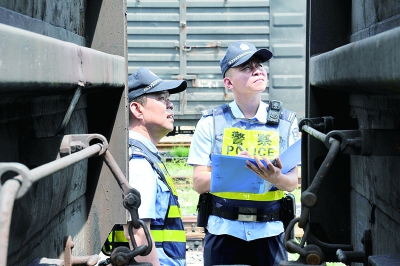 在安康东站,密集的钢轨和一列列货车在热传导效应下将整个货场变成了一个“火海”,行走在期间有种蒸桑拿的感觉。安康东所民警实行分班轮组白昼不间断巡查,将清站查车、打击货盗、隐患排查、路外宣传等日常工作做到事无巨细。杨长空 刘耀武 摄
