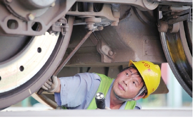 针对高温天气对机车设备造成的不良影响,延安机务段加大机车专检专修力度,及时排除设备隐患。图为7月25日,该段检修车间职工在地沟检查入库机车走行部状态。郜军山 摄