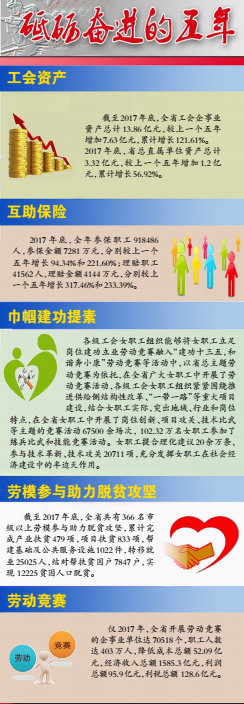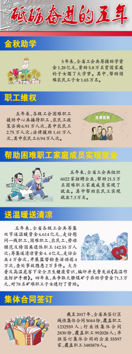 五年来,各级工会按照“围绕中心、服务大局、服务基层、服务职工”的工作思路,助力我省追赶超越主旋律,为“强基层、补短板、增活力”添动力,把暖心服务、个性化服务送到职工身边,让职工群众真正感受到工会是最可信赖的“职工之家”,工会干部是最可信赖的“娘家人”。