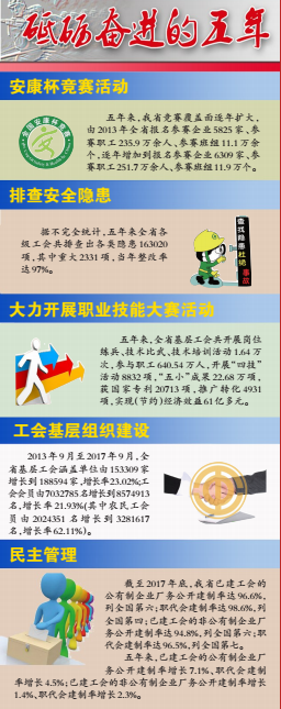 组织安全生产百日行动。不断扩大“安康杯”竞赛覆盖面,参赛企业增加到6309家,参赛职工增加到251.7万余人,参赛班组增加到11.9万个,五年来排查整改各类安全隐患16.3万项,有力促进了企业安全生产,为职工群众撑起了“安全保护伞”。