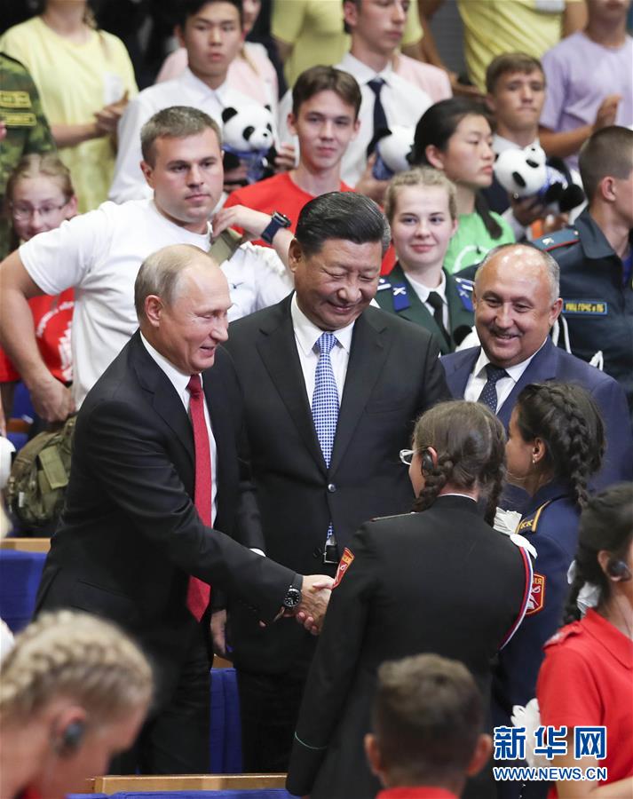 2018年9月12日,国家主席习近平在符拉迪沃斯托克同俄罗斯总统普京一起访问“海洋”全俄儿童中心。这是习近平和普京在“海洋”全俄儿童中心接待汶川地震灾区儿童10周年纪念仪式上同孩子们亲切交谈。 记者谢环驰摄