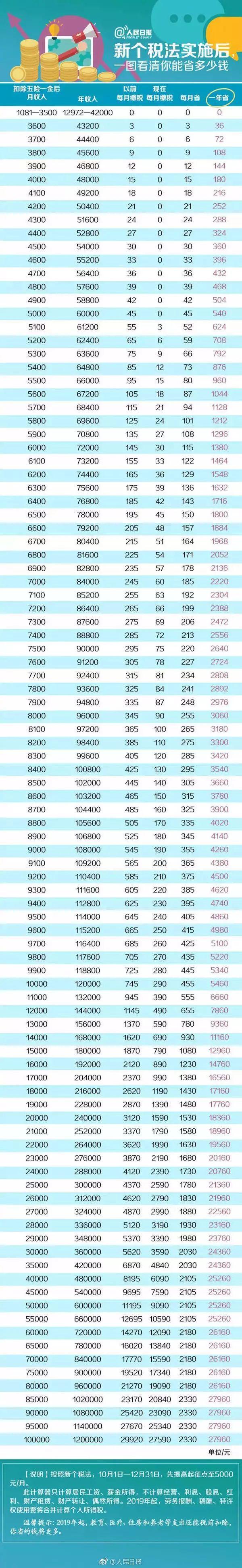8月31日,备受社会关注的个人所得税法修正案终于通过了!新个税法于2019年1月1日起施行,2018年10月1日起施行最新起征点和税率。新个税法规定,自2018年10月1日至2018年12月31日,纳税人的工资、薪金所得,先行以每月收入额减除费用五千元以及专项扣除和依法确定的其他扣除后的余额为应纳税所得额,依照个人所得税税率表(综合所得适用)按月换算后计算缴纳税款,并不再扣除附加减除费用。