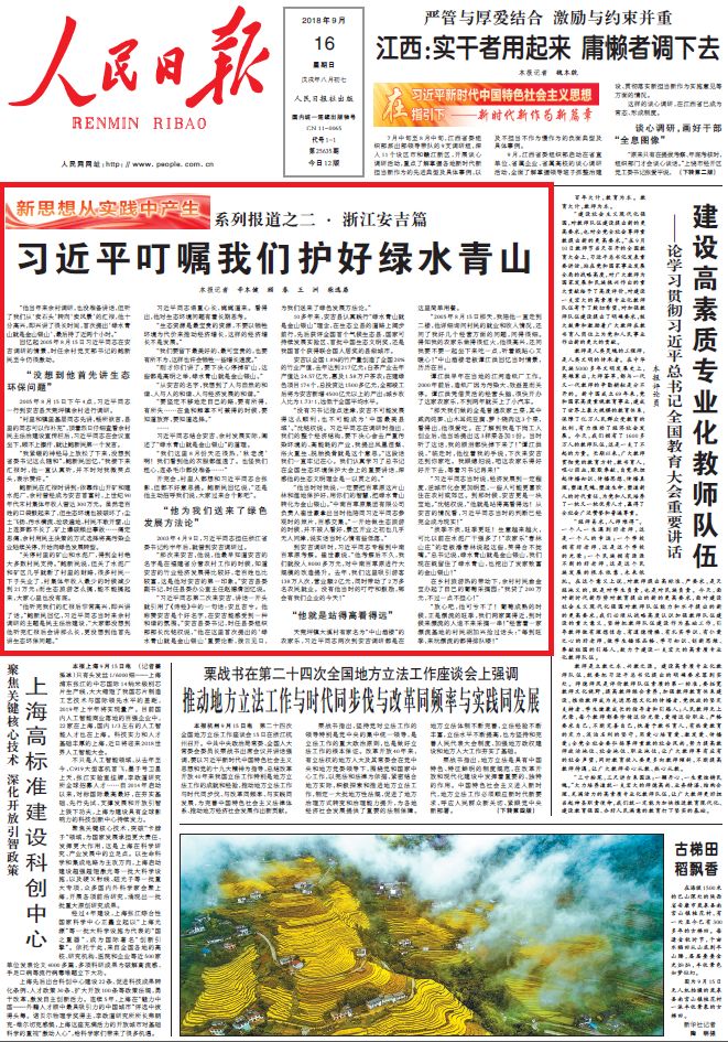 9月16日,专栏第二篇《习近平叮嘱我们护好绿水青山》选在了浙江安吉,习近平在主政浙江期间,分别于2003年、2005年在此进行调研,既然栏目是“新思想从实践中产生”,这一新思想已经呼之欲出——“绿水青山就是金山银山”,这一重要发展理念,就是习近平在安吉调研时首次提出的。人民日报记者采访了当地的多名干部群众,详细讲述了“两山论”的起源。