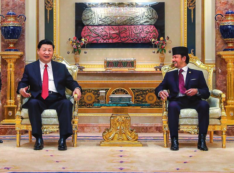 习近平抵达王宫时,哈桑纳尔在停车处热情迎接。两国元首登上检阅台。仪仗队行礼,军乐队奏中文两国国歌。现场鸣放21响礼炮。在哈桑纳尔陪同下,习近平检阅仪仗队。检阅毕,两国元首前往王宫内廷。习近平同文莱王室成员、主要官员及各国驻文莱使节握手。哈桑纳尔同中方陪同人员握手。