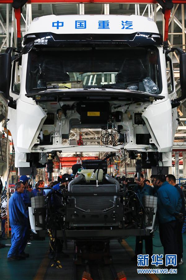 工人在中国重汽集团济宁商用车总装生产线上装配汽车(11月22日摄)。 (李明放 摄)