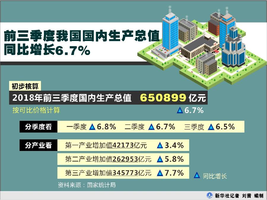 今年前三季度,中国国内生产总值增长6.7%,增速在主要经济体中居于前列;城镇新增就业1107万人。全年粮食产量可望保持在1.2万亿斤以上;国际收支、企业利润、劳动生产率等主要指标处于合理区间。