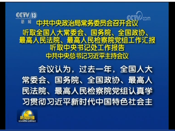 会议强调,今年是新中国成立70周年,是全面建成小康社会、实现第一个百年奋斗目标的关键之年。面对当前复杂严峻的国际形势和繁重艰巨的改革发展稳定任务,全国人大常委会、国务院、全国政协、最高人民法院、最高人民检察院党组要带头增强“四个意识”、坚定“四个自信”、做到“两个维护”,自觉在思想上政治上行动上同以习近平同志为核心的党中央保持高度一致。要始终坚持以习近平新时代中国特色社会主义思想为指导,深入领会党中央对重大形势的科学判断和对重大工作的决策部署,切实履职尽责,凝聚和激发各方面积极性、主动性、创造性,精准发力做好各项工作。要按照新时代党的建设总要求,认真履行全面从严治党主体责任,严肃党内政治生活,严格执行民主集中制,带头贯彻中央八项规定及其实施细则精神,坚决防止和克服一切形式主义、官僚主义,为全面建成小康社会收官打下决定性基础,以优异成绩迎接中华人民共和国成立70周年。