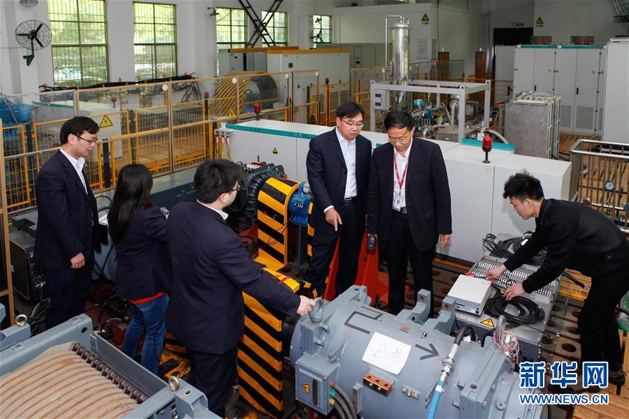 中车株洲电力机车研究所副总经理、总工程师冯江华(右三)在指导地铁永磁直驱电机试验(2016年3月21日摄)。 新华社发(刘亚鹏 摄)