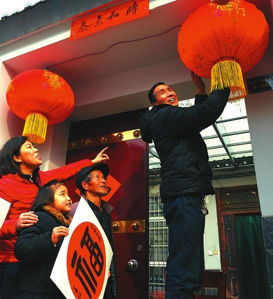 1月26日,村干部为85岁老党员芮生茂的新居挂上喜庆的大红灯笼。当日,西安市长安区文联联合五台街道组织书法家和摄影师来到石砭峪新村为村民义写春联、拍摄全家福,并上门为搬迁群众送去灯笼和新春祝福。 记者 巨跃先摄