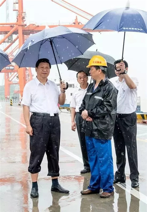 2013年7月21日,习近平冒雨来到武汉新港阳逻集装箱港区。雨下得很大,积水没过了脚面。他卷起裤腿,打着雨伞,向工作人员了解物流等情况。