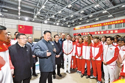 随后,习近平来到国家冬季运动训练中心,在短道速滑馆结合展板听取速滑、花滑项目介绍,之后进入馆内察看国家速滑队、花滑队训练备战情况。看到运动员们在冰面上挥洒汗水、刻苦备战,习近平表示赞许,叮嘱他们科学训练、注意安全。习近平步行前往冰壶馆,察看国家冰壶队训练备战情况。运动员、教练员看到习近平来了,争相围拢过来。习近平勉励他们注重选拔培养好人才,增强为国争光的荣誉感,坚定创造佳绩的信心,刻苦训练、全力备战、勇攀高峰,力争实现新的突破。冰壶馆前厅的沙盘,展示了首钢北区和冬奥会滑雪大跳台规划建设情况,习近平边看边问。他强调,体育强则国家强,国家强则体育强。发展体育事业不仅是实现中国梦的重要内容,还能为中华民族伟大复兴提供凝心聚气的强大精神力量。我们要弘扬中华体育精神,弘扬体育道德风尚,推动群众体育、竞技体育、体育产业协调发展,加快建设体育强国。考察结束时,习近平同运动员、教练员和工作人员代表等握手告别,现场响起热烈的掌声。