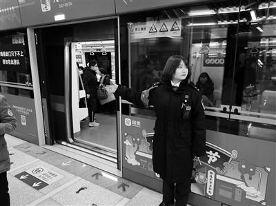 2月6日,在西安地铁四号线大雁塔站站台上,年轻的站务员刘玺和往常一样,依旧在忙碌着,她一边通过对讲机与到站的地铁司机交流着站台的情况,一边不停地在站台上巡查,维护着乘车秩序。这个春节,由于大雁塔附近新年游园活动多,出现了大客流,刘玺和她的同事假期在车站度过。