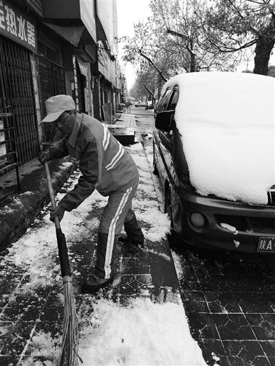 正月初六,马广田老乡的孩子结婚,正月初五下午下班后,他坐地铁去东郊看看。老乡说一定要等正月初六看着娃结婚。凌晨,接到单位电话,要赶往岗位。“跑到街上,连个出租车都没有。”马广田说,预报有雪,得赶紧到岗,他急得没办法,赶早上6点第一趟地铁回到了岗位上。一到团结西路,他就拿起扫帚,忙着扫雪,一直干到下午1点多。路面干净了,马广田和他的同事才开始吃午饭。