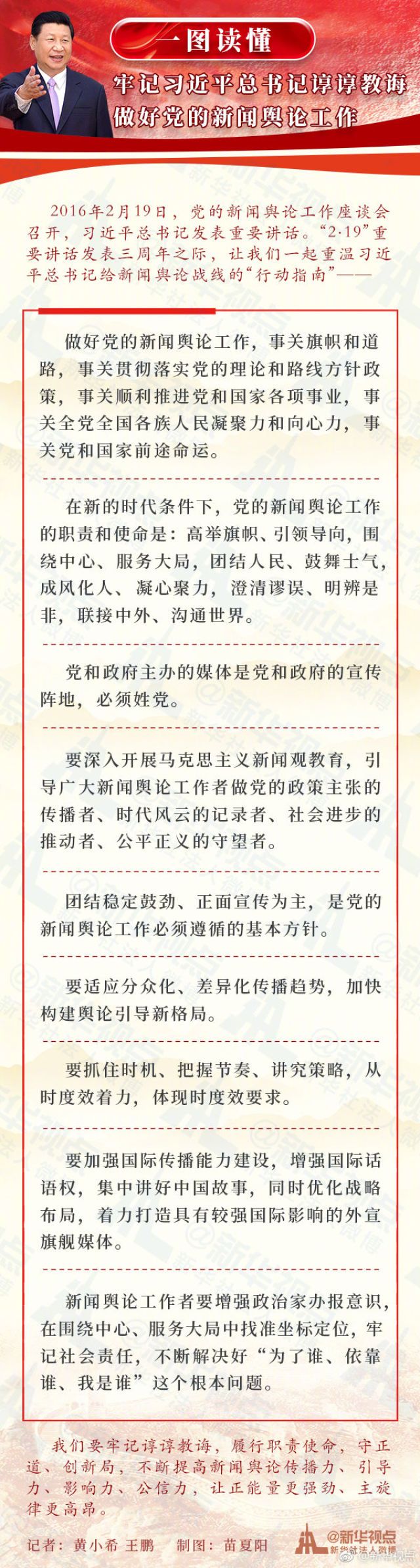 #领航中国#【一图读懂 | 牢记习近平总书记谆谆教诲 做好党的新闻舆论工作】2016年2月19日,党的新闻舆论工作座谈会召开,习近平总书记发表重要讲话。“2•19”重要讲话发表三周年之际,让我们一起重温习近平总书记给新闻舆论战线的“行动指南”——