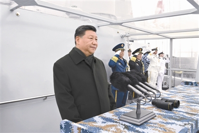 4月23日,在中国人民解放军海军70华诞之际,中共中央总书记、国家主席、中央军委主席习近平出席在青岛举行的庆祝人民海军成立70周年海上阅兵活动。图为习近平检阅舰艇编队。 记者 李刚 摄